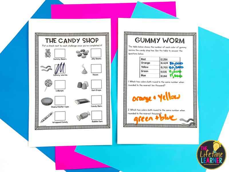 Introducing Candy Shop Day! Students enter sugar-heaven during the Candy Shop Classroom Transformation. Throughout the day, your fourth-graders will “work” in a candy shop solving 10 candy-themed math challenges. Between the colorful signs and decorations included for you, the transformation comes to life for your students. You can even incorporate some real-world math by rounding with real candy at the end of the day. Thus, it provides a hands-on example of math for your students.
