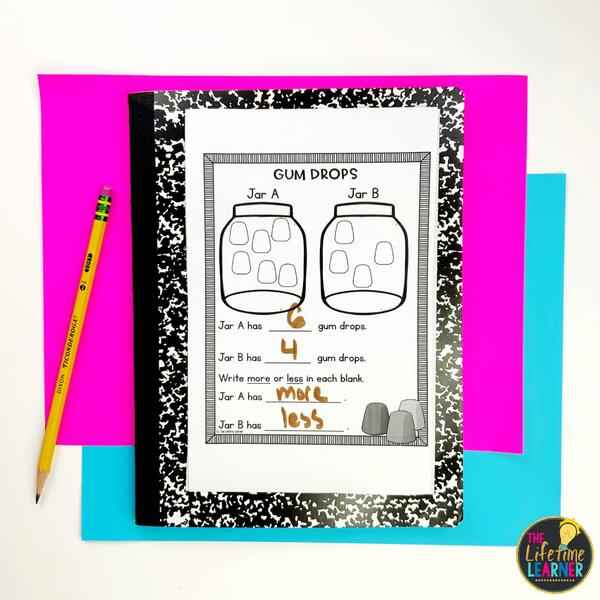 In the Candy Shop Classroom Transformation, kindergarteners practice counting objects by using real candy! The room is decorated with candy decorations such as banners, door signs, and colorful pictures to make it feel like a real candy shop. Throughout the day, students solve 10 candy-themed math worksheets that practice counting objects in a scattered group and telling if one group has more or less, all the while experiencing a sweet day in the classroom.