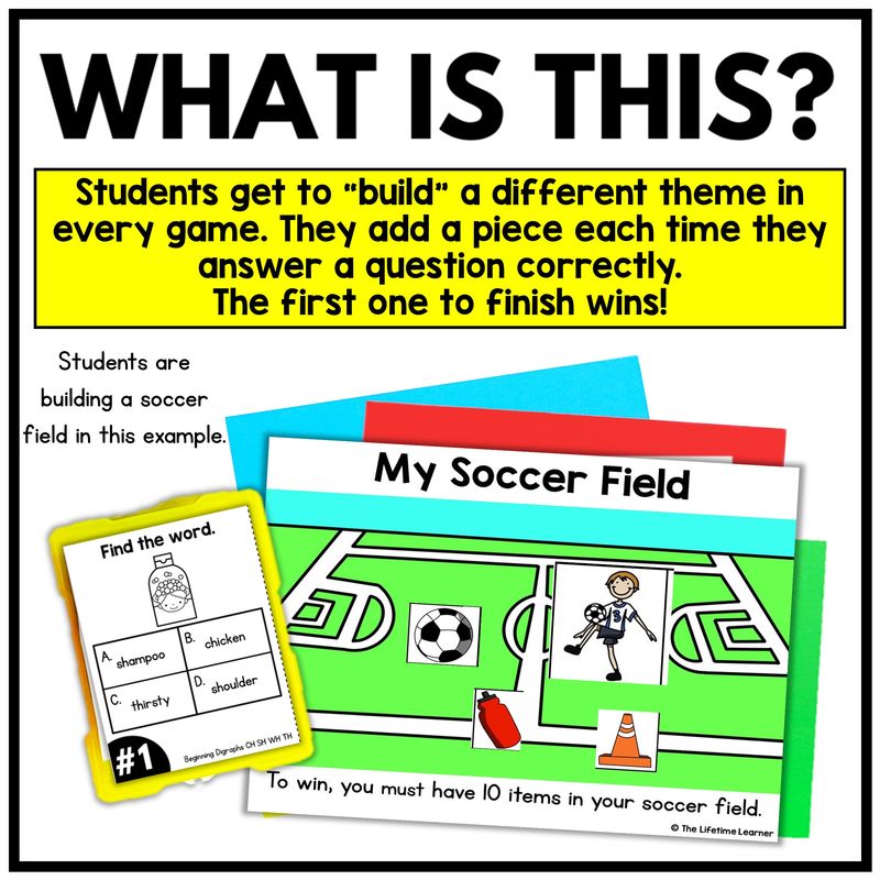 Build It games are hands-on classroom games where students earn a piece of a picture every time they answer a question correctly. As play continues, students slowly build a full scene—such as a soccer field, ice cream sundae, castle, or space scene—one piece at a time. The first student to complete their picture wins, but the real win is the steady, meaningful practice happening along the way.