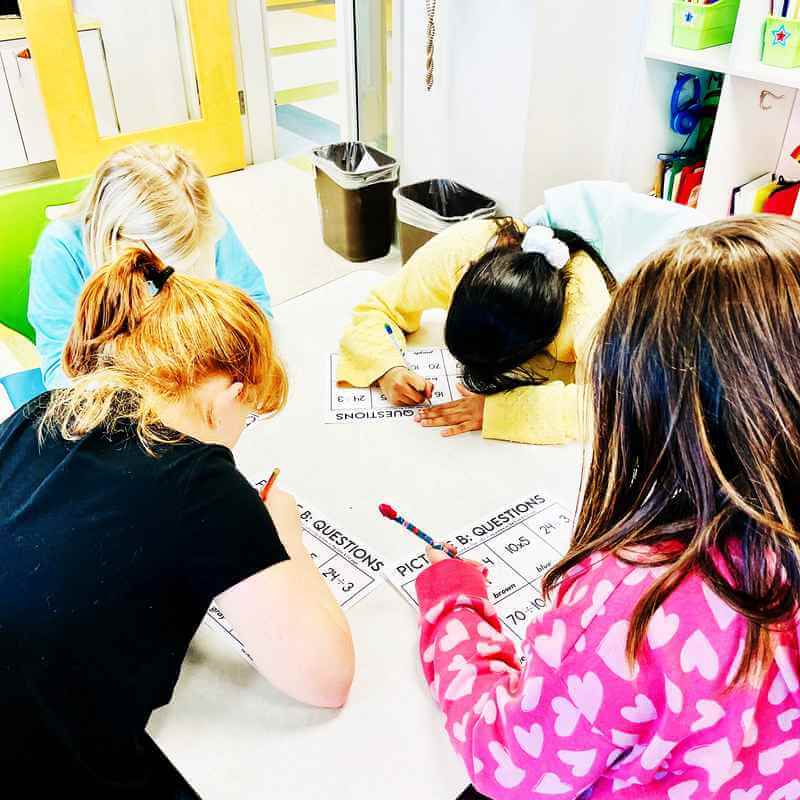 Students work in small groups to complete a color-by-code picture together.