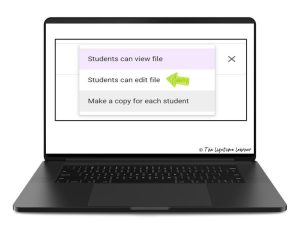 On the right side drop-down menu, change it from “view” to “STUDENTS CAN EDIT FILE”. We are doing this because this will allow all of the students to access and edit the file at the same time. If you click “view file”, they won’t be able to type in their answers and manipulate the pieces in the classroom transformation. If you click “make a copy”, every student gets their own copy and they won’t be working on the same copy together.