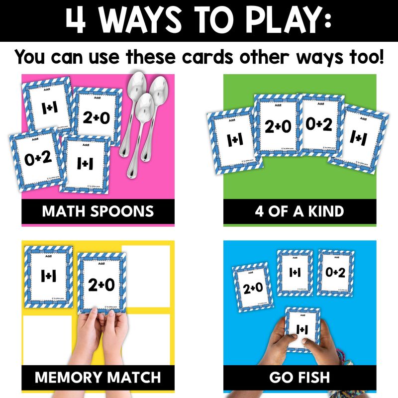 You can also use these game cards to play Go Fish, Memory Match, and Four of a Kind. You’re really getting four games in one! You can use Math Spoons to: