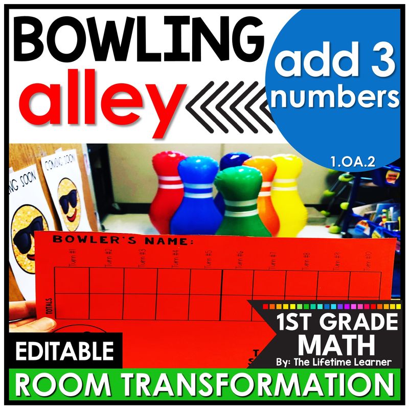 It’s time for a bowling field trip in this engaging 1st grade bowling room transformation or math escape room! First grade students review adding 3 numbers in a FUN way with tons of bowling pin activities (1.OA.2)! This EDITABLE bowling theme classroom transformation has lots of math activities including a bowling score sheet, bowling pin math, and addition worksheets. It’s the perfect math activity to use on any bowling day when reviewing adding three numbers in equations and in word problems. Print and digital versions are included.