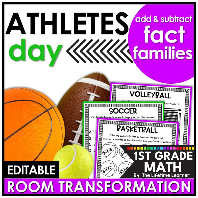 It’s sports day in this engaging 1st grade room transformation or sports math escape room! First grade students review addition and subtraction fact families in a FUN way with tons of sports activities! This EDITABLE sports theme classroom transformation has lots of fact family activities including addition and subtraction to 20. The sports theme day also comes with sports themed classroom decor, a sports craft (athlete hat), a sports coloring page, sports name tags, and more. Great for March Madness. Print and digital versions are included.