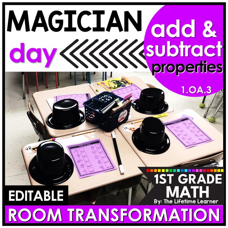 It’s magician day in this engaging 1st grade room transformation or math escape room! First grade students review addition properties in a FUN way with tons of magic activities in this theme day! This EDITABLE magical classroom transformation focuses on the commutative property of addition and the associative property of addition. It’s the perfect math activity to use on any Magic Day and comes with write the room activities, a printable magician hat, magician classroom decor, magical name tags, a magician coloring page, and more. Print and digital versions are included.