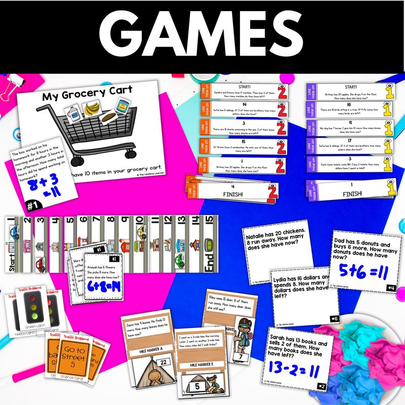 This 1st grade math unit is jam-packed with first grade math worksheets, games, and activities for grade 1 students! You can use this as a supplement to your curriculum or use it solely as your skill practice for addition and subtraction word problems to 20. Practice 1st grade addition and subtraction word problems within 20 in a variety of ways in this 1st grade math review unit. Check out the preview to see everything that is included.