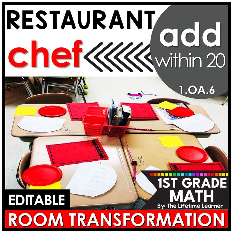 It’s restaurant chef day in this engaging 1st grade room transformation! First grade students review addition to 20 in a FUN way with tons of cooking activities! This EDITABLE kitchen chef theme classroom transformation has lots of addition activities (1.OA.6) including adding with pictures, addition within 20, adding on a number line, and more. It’s the perfect restaurant math activity to use in a restaurant dramatic play center or on a chef theme day. This comes with restaurant decor, a printable chef hat, and could be a restaurant project at the end of an addition unit. Print and digital versions are included.