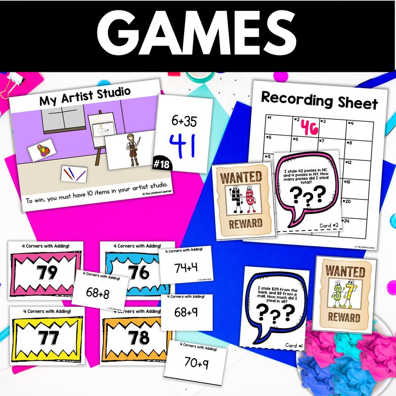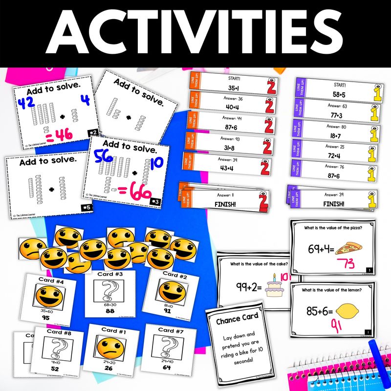 This 1st grade math unit is jam-packed with first grade math worksheets, games, and activities for grade 1 students! You can use this as a supplement to your curriculum or use it solely as your 1st grade skill practice for addition to 100 (2 digit plus 1 digit numbers & 2 digit plus multiples of 10). Practice adding to 100 of ways in this 1st grade math review unit. Check out the preview to see everything that is included.