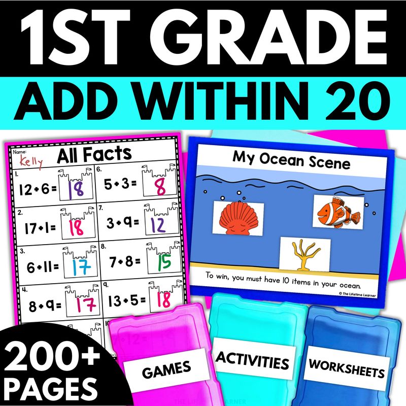 This 1st grade math unit is jam-packed with first grade math worksheets, games, and activities for grade 1 students! You can use this as a supplement to your curriculum or use it solely as your 1st grade skill practice for adding to 20. Practice addition to 20 with pictures in a variety of ways in this 1st grade math review unit. Check out the preview to see everything that is included.