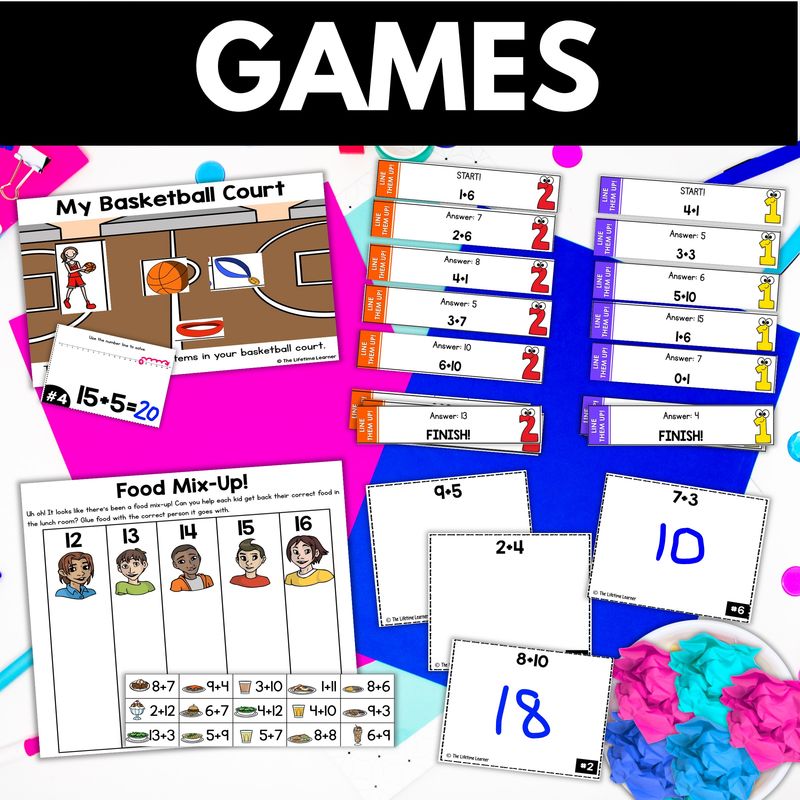 Each player gets a background to build their basketball court on. Playing cards and pieces go in the middle. Each time you get an answer correct, you earn a piece for your basketball court. Chance cards are provided to spice up gameplay. You never know who’s going to win with these included! The first person to finish getting 10 items on their basketball court wins! All task cards focus on addition to 20.