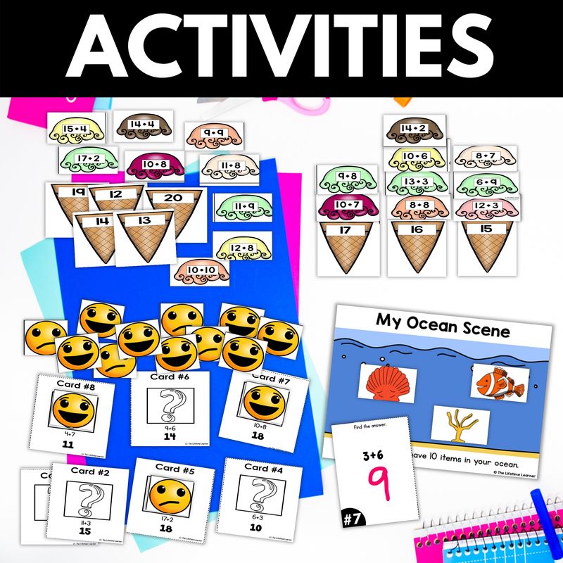 Each player gets a background to build their ocean scene on. Playing cards and pieces go in the middle. Each time you get an answer correct, you earn a piece for your under the sea scene. Chance cards are provided to spice up gameplay. You never know who’s going to win with these included! The first person to finish getting 10 items on their ocean background wins! All task cards focus on addition to 20.