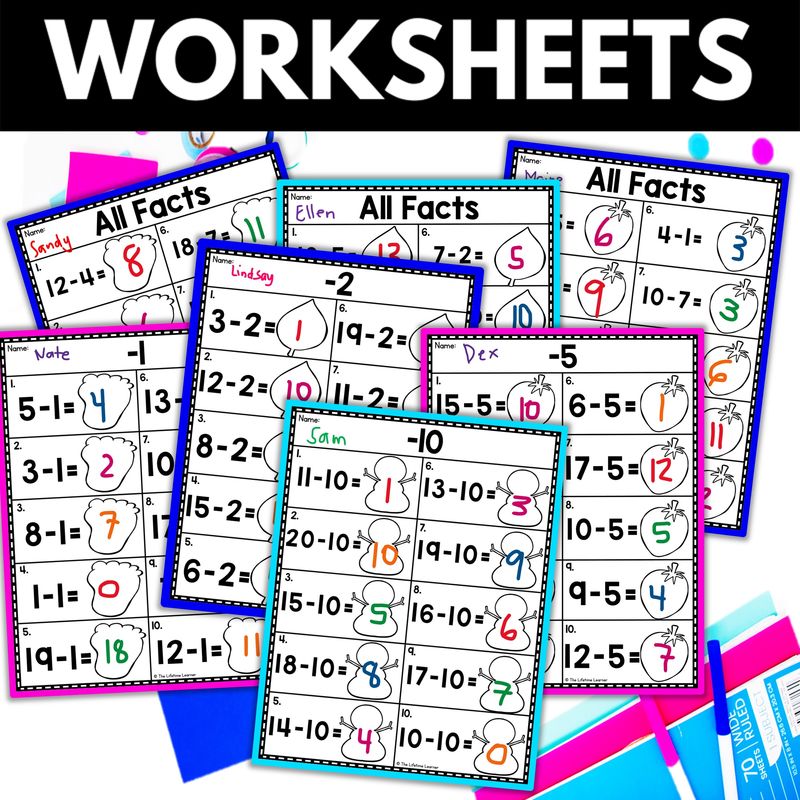 20 Subtraction to 20 Worksheets: Students solve subtraction problems using visual supports, missing numbers, and real-world themes. Includes ten single-fact pages and ten mixed review pages.