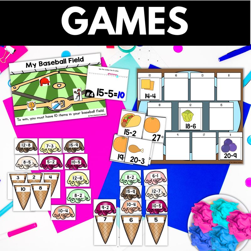 Students will work with picture models, number sentences, and themed math games to reinforce key subtraction strategies. Whether you’re introducing subtraction, reviewing fluency within 20, or differentiating for small groups, this resource gives you everything you need to make learning subtraction fun and effective.