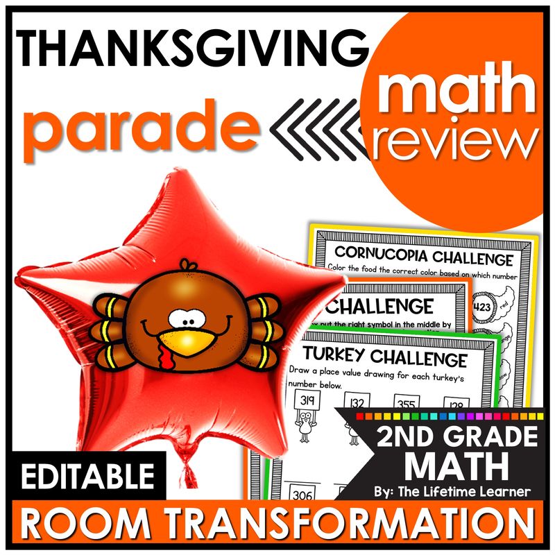 Get ready for the Thanksgiving Parade! This 2nd Grade Thanksgiving math activity is a fun and EASY Thanksgiving classroom transformation! Use this second grade Thanksgiving escape room after reading the book Balloons Over Broadway anytime in November! This Thanksgiving room transformation is a themed learning day with Thanksgiving door decor, balloon posters, name tags, and Thanksgiving treat ideas as well as EDITABLE Thanksgiving math worksheets. Print and digital versions (Thanksgiving google slides) are included.