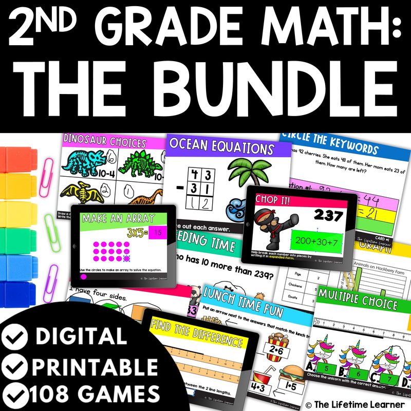 Grab this 2nd Grade Math Task Card Bundle today and give your students 108 print and digital games covering all 27 second grade math skills!