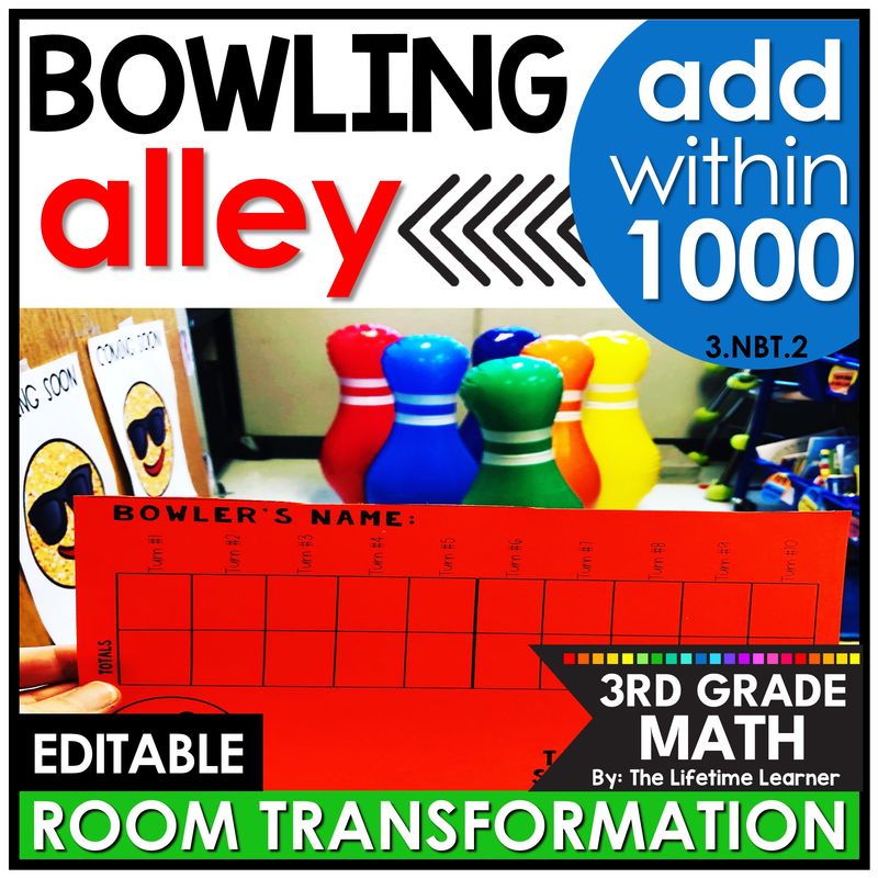 It’s time for a bowling field trip in this engaging 3rd grade bowling room transformation or math escape room! Third grade students review multi-digit addition within 1000 in a FUN way with tons of bowling pin activities (3.NBT.2)! This EDITABLE bowling theme classroom transformation has lots of math activities including a bowling score sheet, bowling pin math, and third grade addition worksheets. It’s the perfect math activity to use on any bowling day when adding large numbers with and without regrouping. Print and digital versions are included.