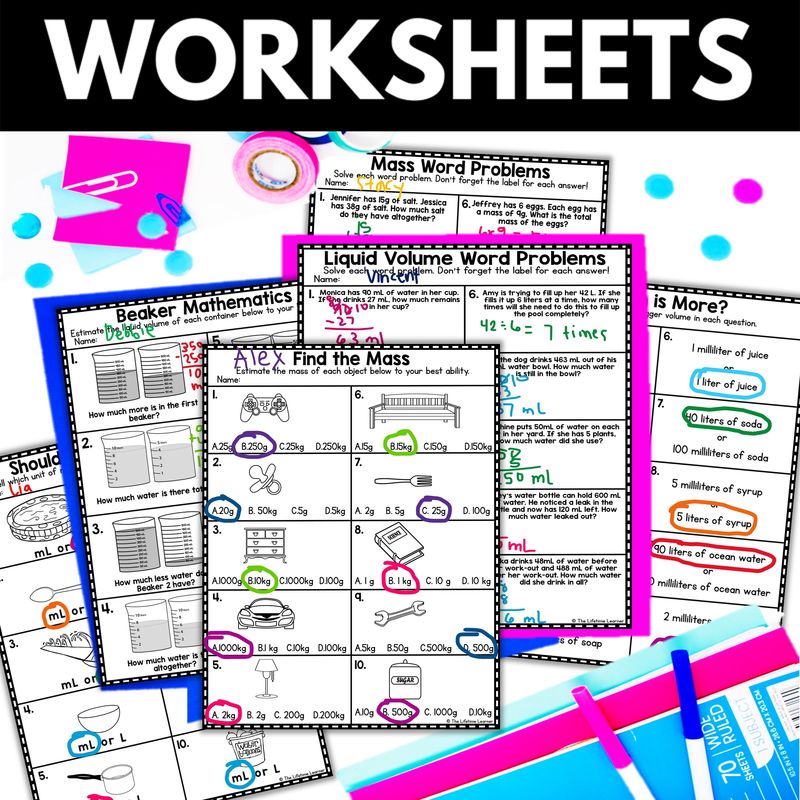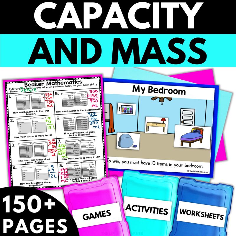 This capacity and mass worksheets resource includes a variety of materials designed for whole-group instruction, small-group practice, and independent learning: