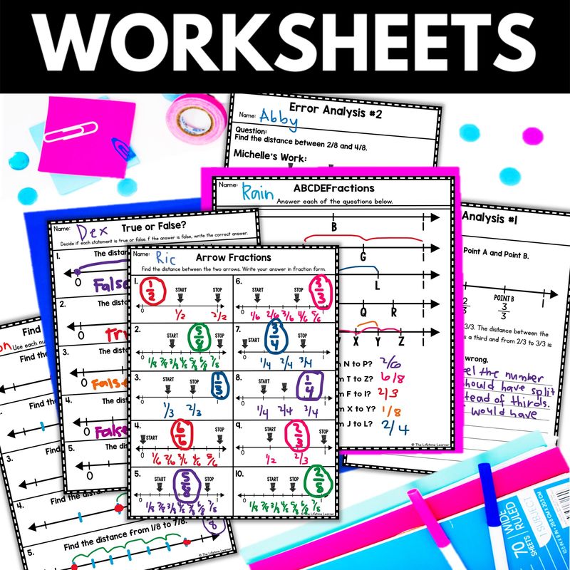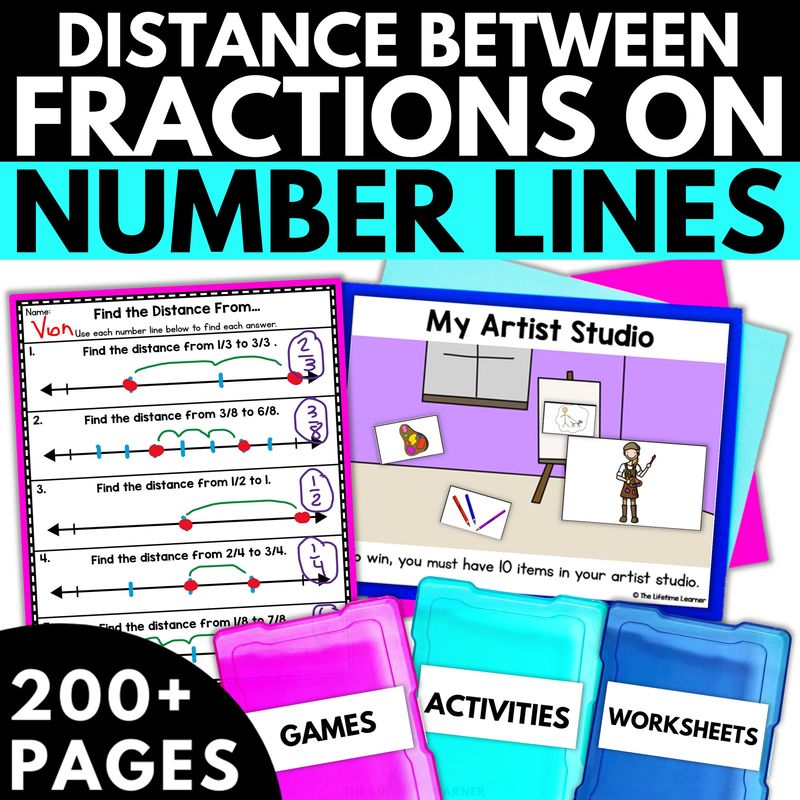 This distance between fractions on number lines worksheets resource includes everything you need for whole-group instruction, small-group practice, and independent learning: