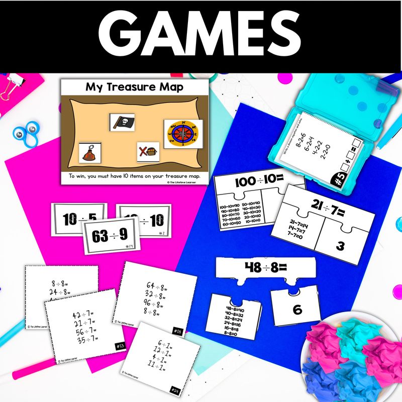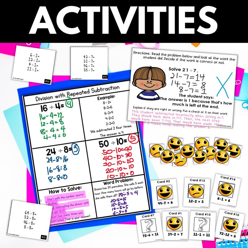 Students practice division through repeated subtraction in a variety of engaging ways, including: