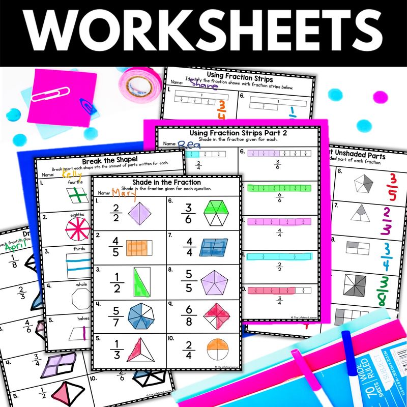 This identifying fractions worksheets resource includes multiple formats for introducing, modeling, and reinforcing fraction concepts: