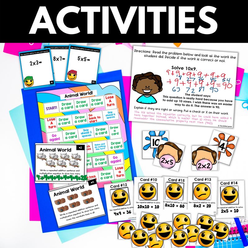 This repeated addition worksheets and activities resource includes a variety of formats for whole-class instruction, small-group learning, and independent practice.