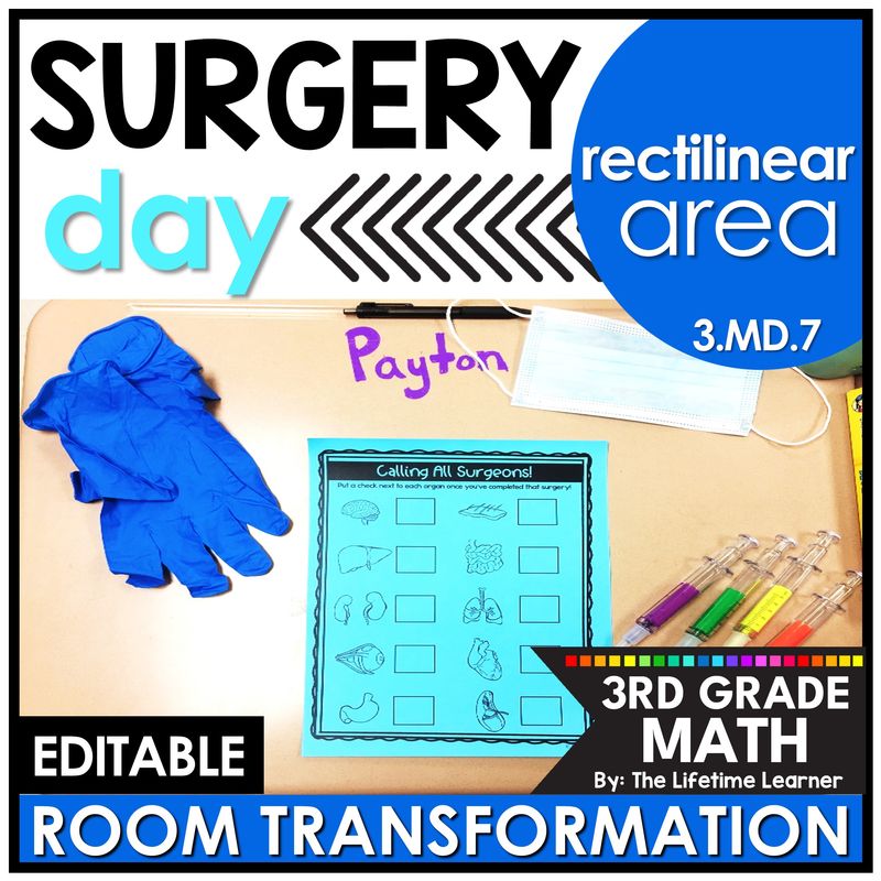 It’s doctor day in this engaging 3rd grade room transformation or math escape room! Third grade surgeons practice finding the rectilinear area of rectangles in a FUN way with tons of surgery activities in this theme day! This EDITABLE doctor classroom transformation focuses on rectilinear area (3.MD.7) and the area of composite figures. It’s the perfect math surgery activity to use on any surgery day and comes with doctor write the room activities, doctor classroom decor, doctor name tags, surgery theme posters, and more. Print and digital versions are included.