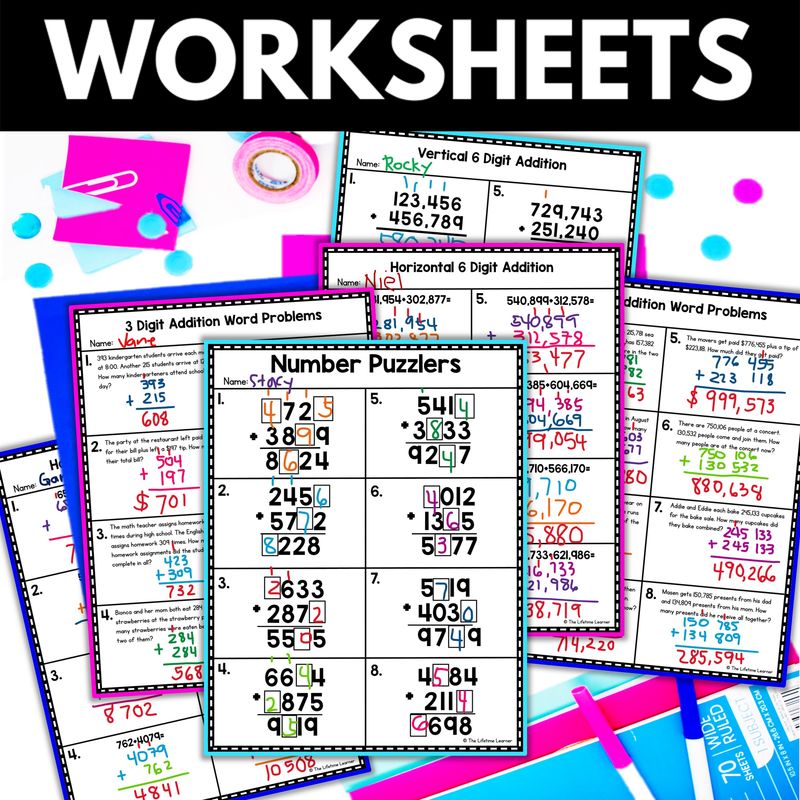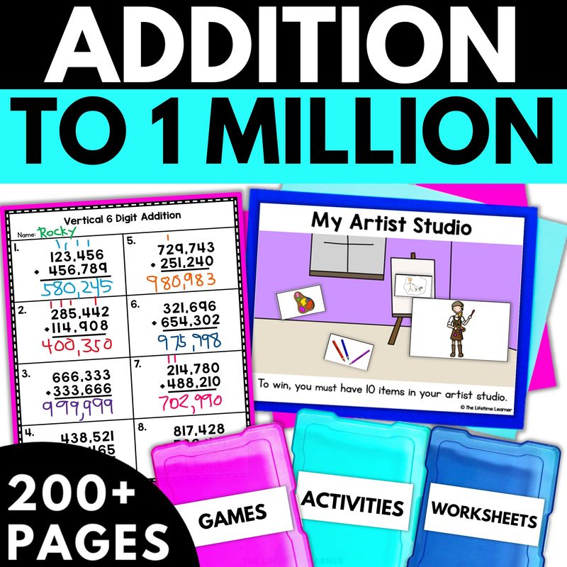 Students will practice 3-digit, 4-digit, 5-digit, and even 6-digit addition — both with and without regrouping — using vertical, horizontal, and word problem formats. It’s everything you need to teach or review addition through one million!