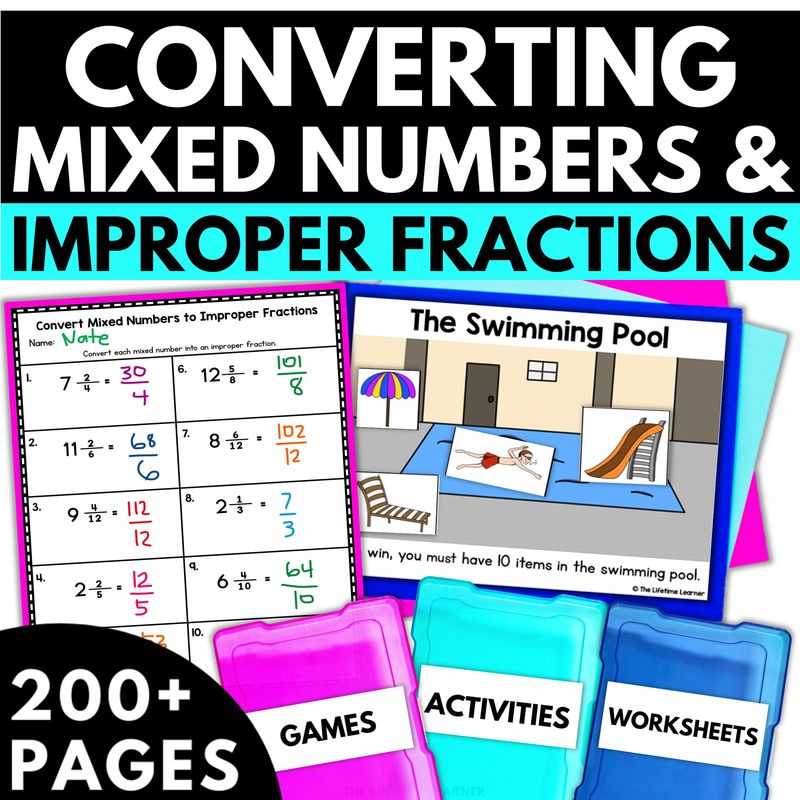 Help your students master fractions with this converting mixed numbers and improper fractions worksheets unit! This 4th grade resource includes everything you need to teach students how to convert improper fractions to mixed numbers and vice versa. With over 200 pages of lessons, activities, and games, this unit makes learning fraction conversions simple, structured, and fun.