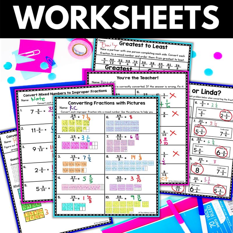 Students practice converting mixed numbers and improper fractions using a variety of strategies. Worksheets include: