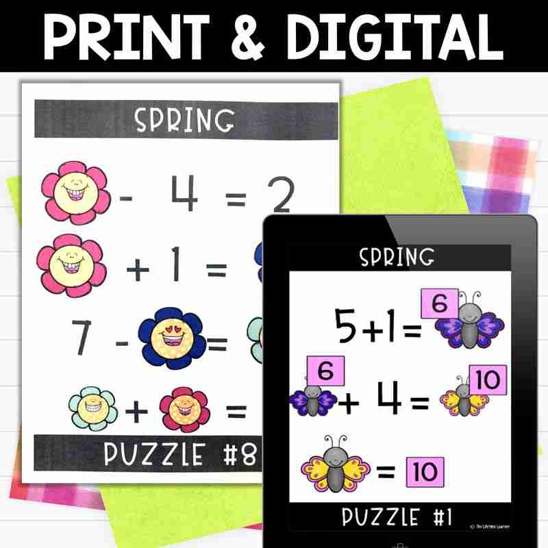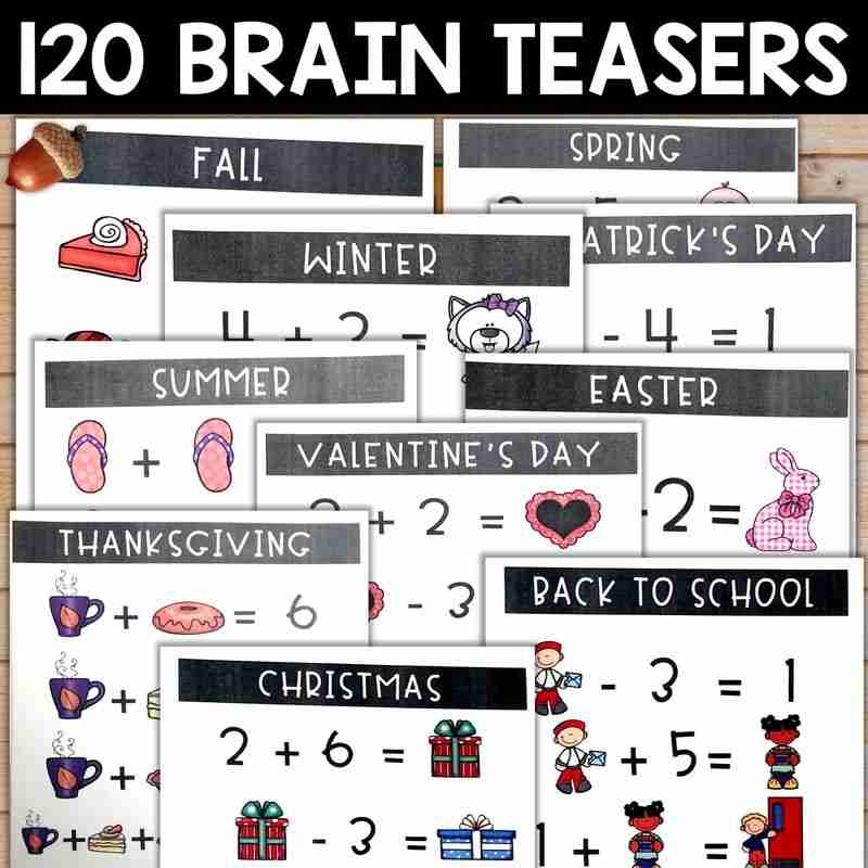 This bundle combines 12 themed packs, each one with 10 puzzles, for a total of 120 addition and subtraction brain teasers within 10. Each puzzle comes in color and black-and-white formats, plus a Google Slides version for projection or paperless assignments.