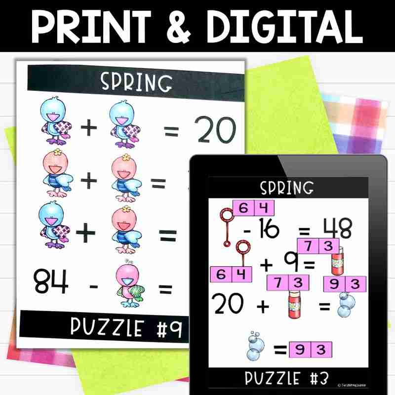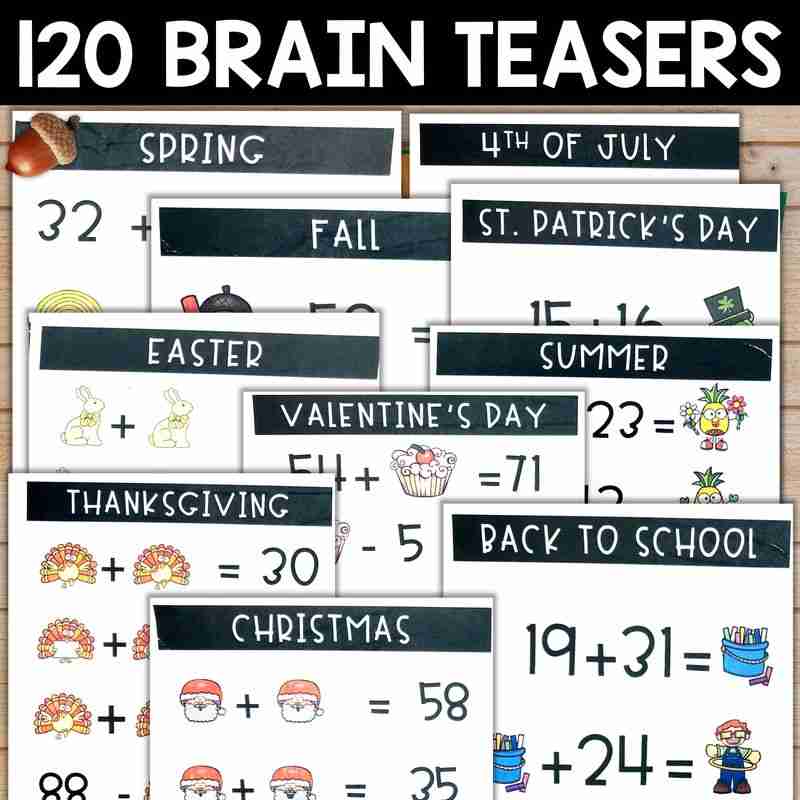 This bundle pulls together 12 themed packs, each with 10 puzzles, for a total of 120 addition and subtraction brain teasers within 100. You’ll receive: