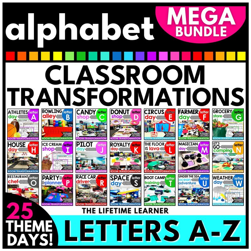 This is the MEGA bundle of 25 Alphabet Letters Classroom Transformations! These fun alphabet activities help make reading memorable and meaningful as students learn to relate learning to the real-world! These reading room transformations are great as preschool and kindergarten reading activities. Each center reviews an important skill students need to practice throughout the year.
