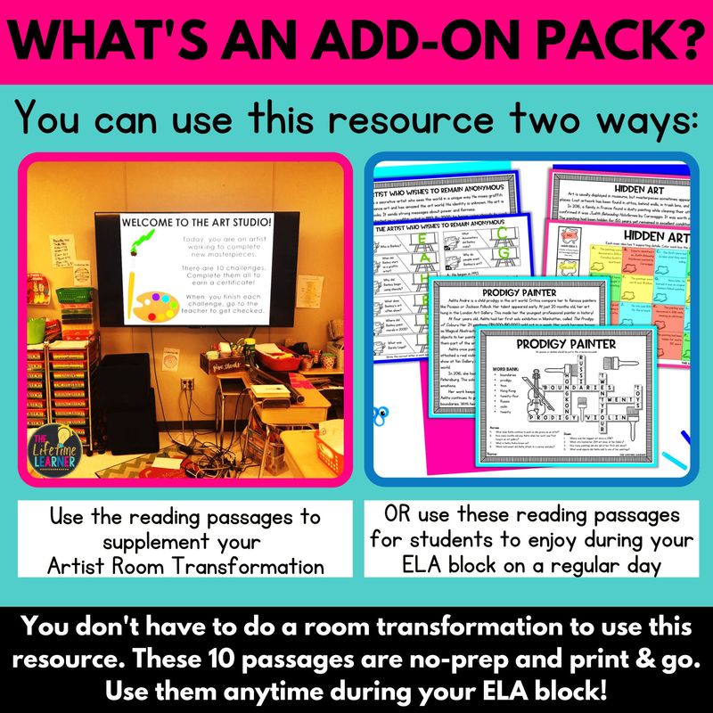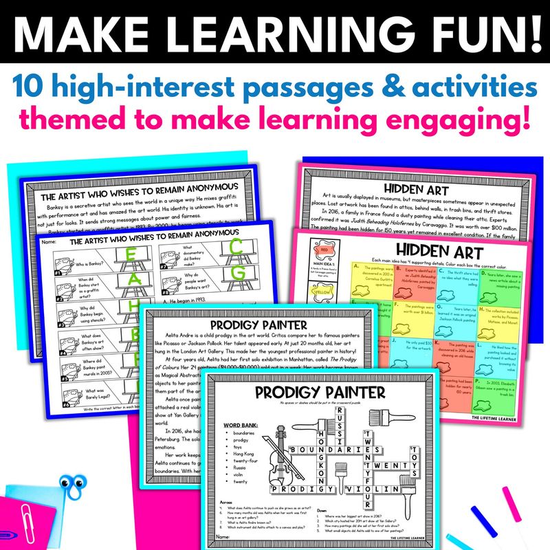 Are you looking for ELA reading passages students will actually WANT to read? Make learning FUN with these 10 art themed reading comprehension passages and activities! Use this “artist add-on pack” of informational reading passages to spiral review nonfiction reading skills during your ELA block OR during an art themed classroom transformation. They’re appropriate for 3rd, 4th, and 5th graders.