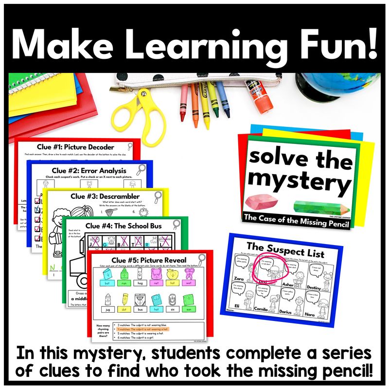No—phonics and grammar mysteries are completely different! They use their own set of clues, target grammar or phonics skills, and end with a unique conclusion. The only shared piece is the starting list of suspects, but each mystery reveals a different culprit. Check out the preview to see the differences in detail—you can absolutely purchase both and enjoy solving the mystery twice!
