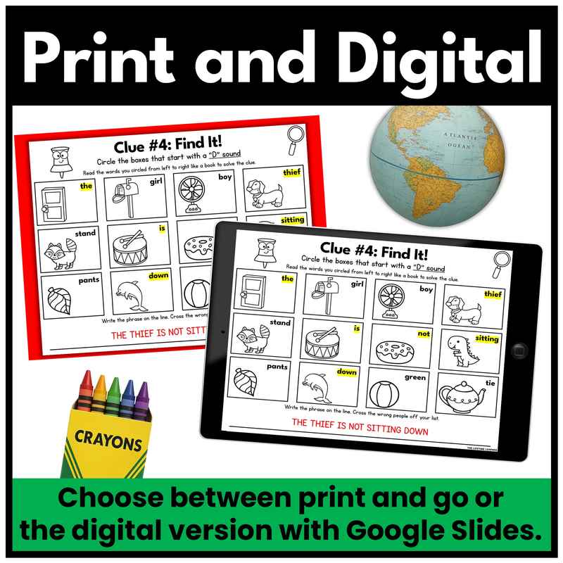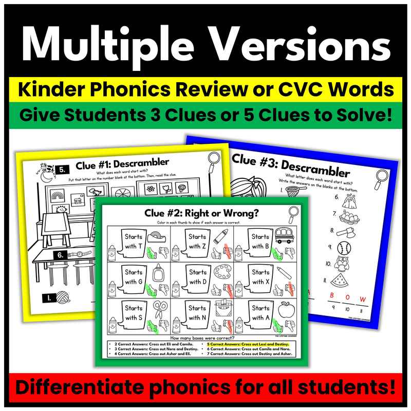 Looking for differentiation? Each resource includes a bonus mystery focused on CVC words. While most of the class works on the main phonics skill, students who need extra practice with CVC words can complete this version instead. The bonus mystery is designed to look and feel exactly like the main one, with the same style of clues and the same final solution. This way, every student is engaged in the same mystery storyline, but the skill level can be adjusted to meet their needs seamlessly.