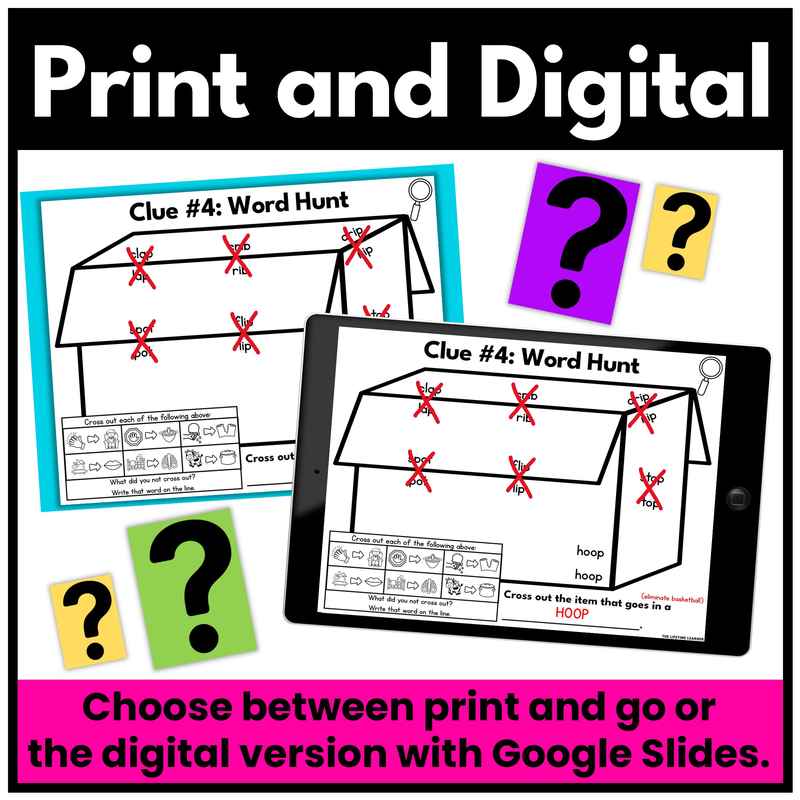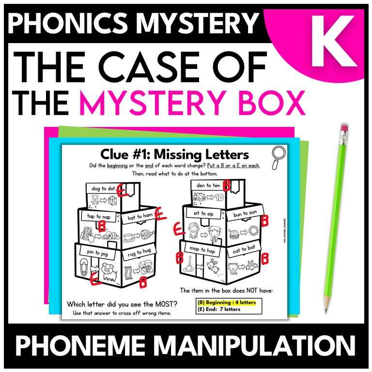 This box phonics mystery kindergarten activity is a fun and engaging way to practice the skill: phoneme manipulation! Designed as an escape room game, student detectives solve clues that are engaging and fun. These printable and digital phonics worksheets turn reading practice into an interactive mystery game for kindergarten and 1st grade. Use it during whole group, small groups with teacher support, or as part of a classroom transformation.