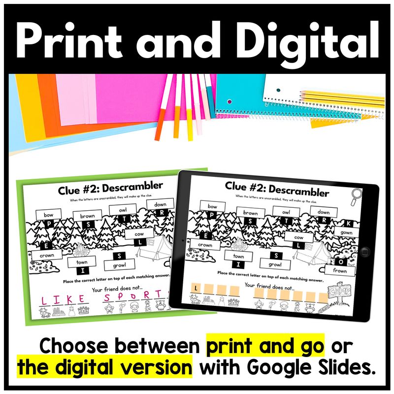 This camping phonics mystery 1st grade activity is a fun and engaging way to practice the skill: diphthongs! Designed as an escape room game, students solve clues that are interactive and exciting. These printable and digital phonics worksheets turn reading practice into an engaging mystery game for 1st grade. Use it during whole group, small groups with teacher support, or as part of a classroom transformation.