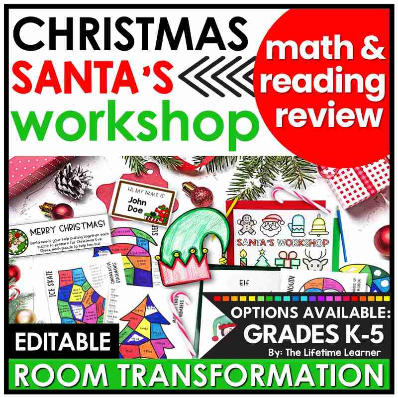 Transform your classroom into a fun themed learning activity with this Christmas math and reading classroom transformation! Engage your students with 20 Christmas activities (10 math and 10 reading). Choose any grade K-5 and receive both subjects! Filled with math and reading worksheets, this themed learning day includes Christmas door decor, name tags, and posters. It’s also perfect as a Christmas math or reading escape room alternative! Print and digital versions are included.