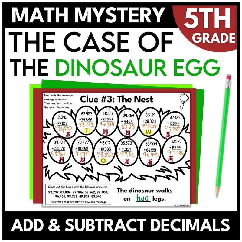 Dinosaur math mystery 5th grade activities are the perfect way to keep students practicing the skill: add and subtract decimals. This resource turns learning into a storyline that feels like a fifth grade math escape room—without the stress of hours of teacher prep. Teachers simply print and go (or assign digitally), and students solve math clues to crack the case.