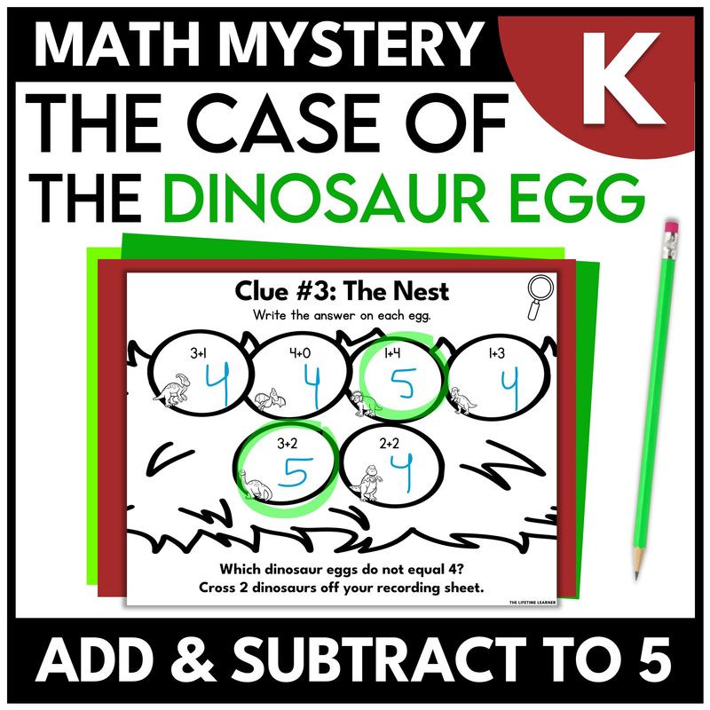 Dinosaur math mystery kindergarten activities are the perfect way to have students add and subtract to 5 while having fun. This resource blends learning with a dinosaur-themed storyline that feels like a kindergarten math escape room—without the stress of hours of teacher prep. Teachers simply print and go (or assign digitally), and students solve math clues to crack the case.