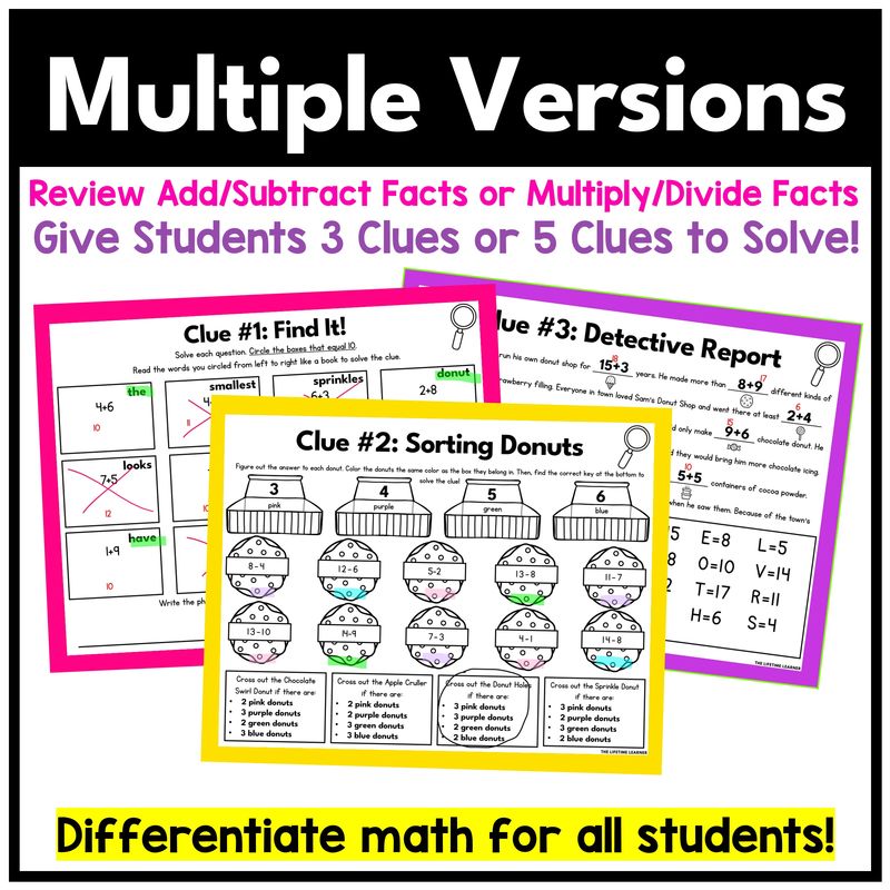 The donut math fact mystery worksheets (aka math clues!) focus on: