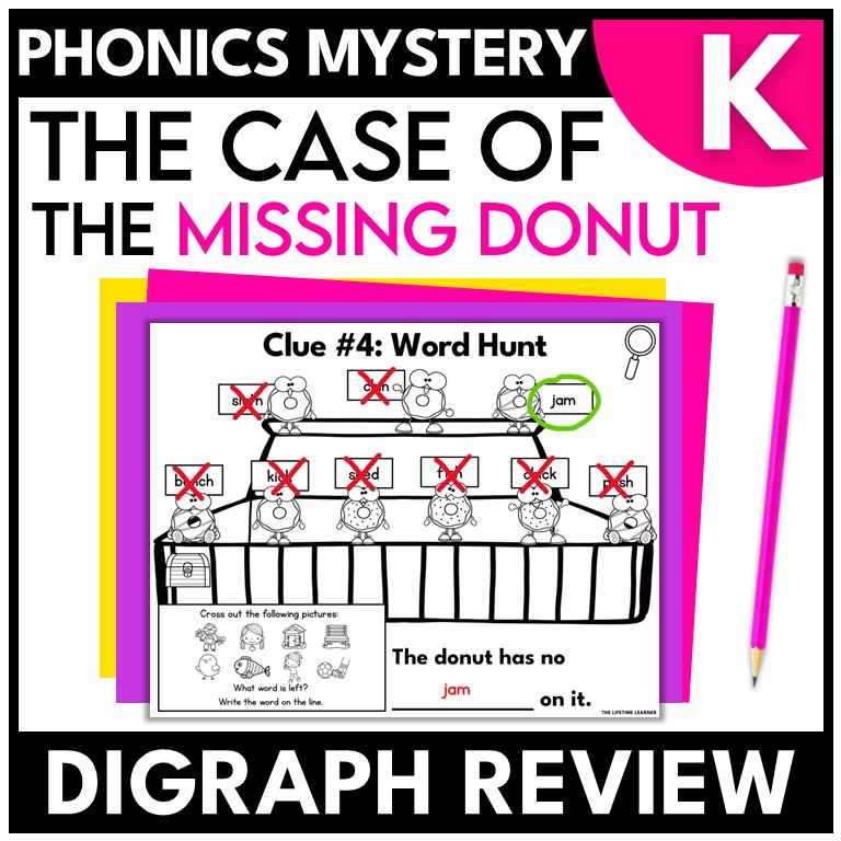This donut phonics mystery kindergarten activity is a fun and engaging way to practice the skill: digraph review! Designed as an escape room game, student detectives solve clues that are engaging and fun. These printable and digital phonics worksheets turn reading practice into an interactive mystery game for kindergarten and 1st grade. Use it during whole group, small groups with teacher support, or as part of a classroom transformation.