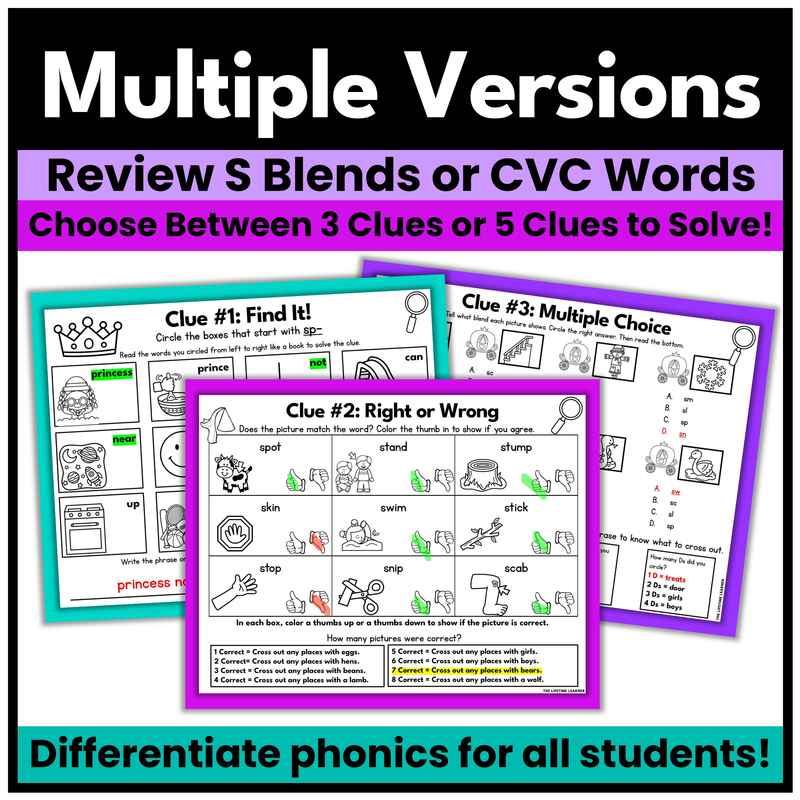 Looking for differentiation? Each resource includes a bonus mystery focused on CVC words. While most of the class works on the main phonics skill, students who need extra practice with CVC words can complete this version instead. The bonus mystery is designed to look and feel exactly like the main one, with the same style of clues and the same final solution. This way, every student is engaged in the same mystery storyline, but the skill level can be adjusted to meet their needs seamlessly.