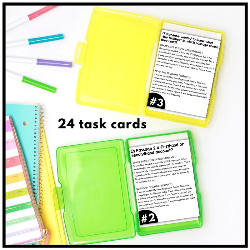 Task cards make abstract skills like distinguishing accounts more concrete. Instead of working through long passages, students get to analyze two short, focused paragraphs at a time. This keeps practice manageable while still rigorous.