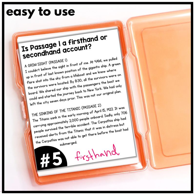 These task cards are aligned to Common Core and TEKS reading comprehension standards. Students get repeated opportunities to analyze passages and distinguish between firsthand and secondhand accounts.