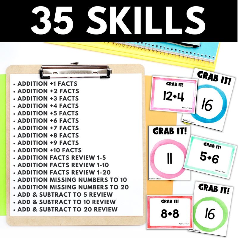 Looking for a way to make addition and subtraction fact practice exciting for your students? The Addition and Subtraction Math Facts Grab It Card Games Bundle is the solution. With 35 ready-to-play games covering 35 fact fluency skills, you’ll have an engaging, low-prep resource that keeps students motivated while mastering the basics of addition and subtraction.