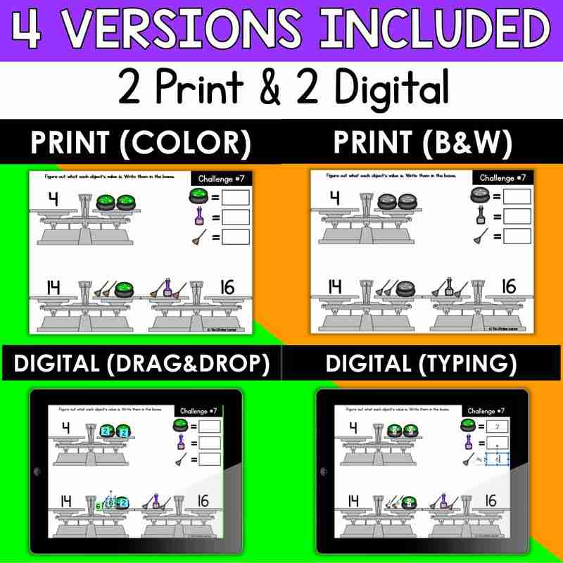 Four formats: print in color, print in black & white, digital drag-and-drop, digital type-in answers