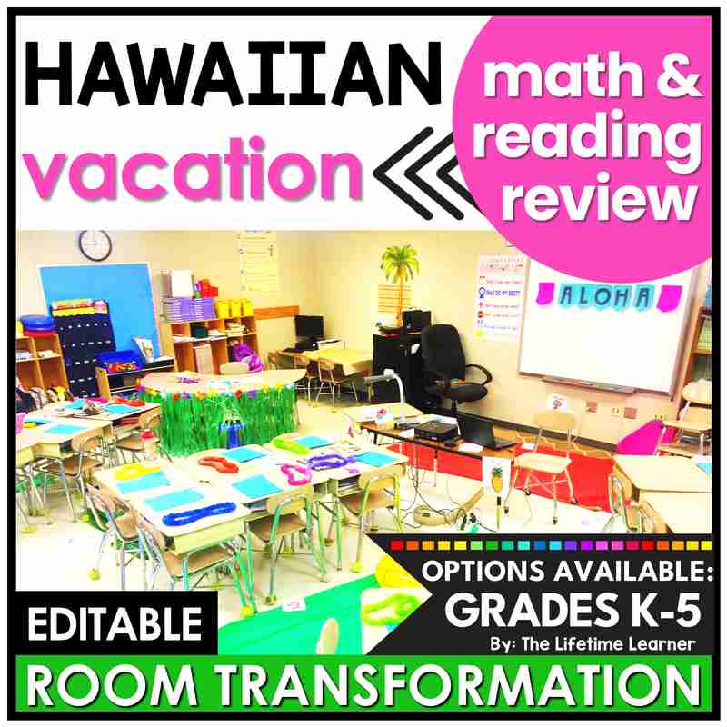 Transform your classroom into a fun themed learning activity with this Hawaii math and reading classroom transformation! Engage your students with 20 Hawaii activities (10 math and 10 reading). Choose any grade K-5 and receive both subjects! Filled with math and reading worksheets, this themed learning day includes Hawaii door decor, name tags, and posters. It’s also perfect as a Hawaii math or reading escape room alternative! Print and digital versions are included.