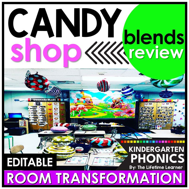 It’s candy shop day in this engaging kindergarten candy theme room transformation or escape room! Kindergarteners review beginning and ending blends in a FUN way with tons of candy theme activities! This EDITABLE testing candy classroom transformation has lots of beginning and ending blends worksheets and activities. It’s the perfect candy phonics activity to use on any candy shop day with kindergarten starting and final blends. Print and digital versions are included.