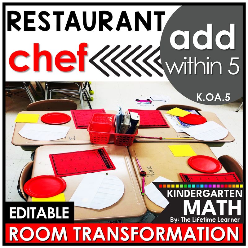 It’s restaurant chef day in this engaging kindergarten room transformation or math escape room! Kindergarten students review adding to 5 in a FUN way with tons of cooking activities! This EDITABLE kitchen chef theme classroom transformation has lots of addition activities (K.OA.5) including addition to 5 with pictures and equations. It’s the perfect restaurant math activity to use in a restaurant dramatic play center or on a chef theme day. This comes with restaurant decor, a printable chef hat, and could be a restaurant project at the end of an addition unit. Print and digital versions are included.